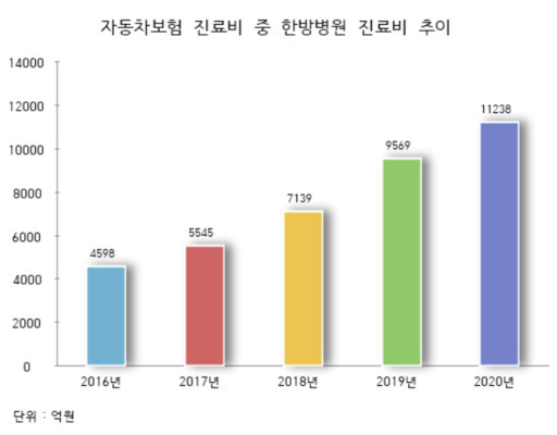 실제 자동차보험 진료비 중 한방병원 진료비는 ▲2016년 4598억원 ▲2017년 5545억원 ▲2018년 7139억원 ▲2019년 9569억원으로 지속해서 큰 폭으로 증가해 왔다. 지난해의 경우 한방병원 진료비가 1조1238억원으로 훌쩍 뛰기도 했다.