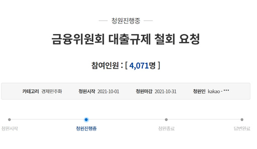 주택가격을 서민이 올렸냐는 비난섞인 지적도 제기됐다. '금융위원회 대출규제 철회요청'이란 제목을 단 청원인은 "있는 사람들이 자기부동산을 늘리고 투자를 하기 위해 대출을 받아 늘어난 것을 두고 대출한도가 다 됐다고 한다"며 "심지어 실거주 의무기간이 있어 전매도, 전세도 줄 수 없는 아파트에 입주하는 것을 두고 서민이 고스란히 피해를 받아야 하냐"고 말했다.