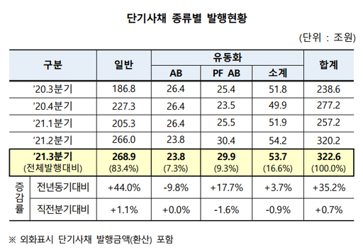 12일 한국예탁결제원에 따르면 단기사채 중 가장 많이 발행된 건 일반 기업이나 증권회사 및 기타 금융회사들이 발행하는 일반 단기사채였다. 일반 단기사채의 발행량은 268조9000억원으로 지난해 같은 기간(186조8000억원) 대비 82조1000억원(44%) 증가했다. 직전 분기(266조원)보단 1.1% 늘었다. 유동화전문회사(SPC)가 발행하는 유동화 단기사채(ABSTB, PFABSTB)의 발행량은 53조7000억원으로 지난해 같은 기간(51조8000억원) 대비 1조9000억원(3.7%) 증가했다. 직전 분기(54조2000억원)에 비하면 0.9% 줄었다.