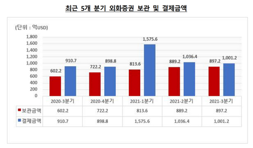 종류별로 보면 외화주식 결제금액은 812억6000만달러로 직전 분기(792억3000만달러) 대비 2.6% 증가했고, 외화채권은 188억6000만달러로 직전 분기(244억1000만달러) 대비 22.7% 감소했다.