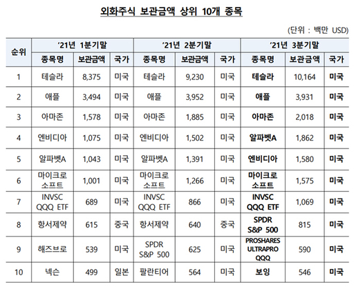 결제금액 상위종목을 보면 10개 중 9개 종목이 미국 주식이었다. 금액은 테슬라(47억5000만달러), 애플(24억달러), 아마존(21억달러) 순으로 높았다. 다만 테슬라의 경우 직전 분기(59억달러)에 비해 결제금액이 19.5% 감소했고, 매도금액(25억7700만달러)이 매수금액(21억7700만달러)을 추월하면서 총합 순매도 4억달러를 기록했다.