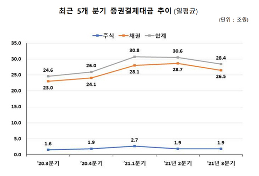 올 3분기 증권결제대금은 일평균 28조4000억원으로 직전 분기(30조6000억원) 대비 7.0% 줄었다. 전년 동기(24조6000억원)에 비하면 15.5% 늘어났다.