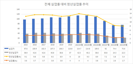 25일 통계청에 따르면 지난 9월 기준 15~29세 청년 실업자수는 22만3000명으로 전체 실업자(75만6000명)의 29.4%를 차지했다.