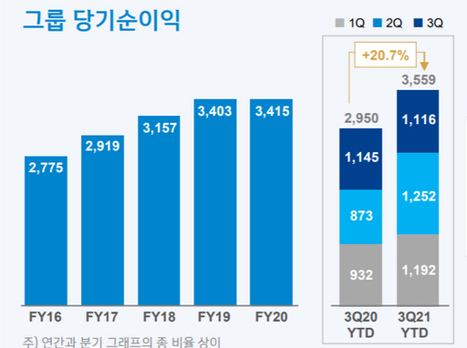 노용훈 최고재무관리자(CFO)는 "시장변동성 확대에도 불구하고 다변화된 수익구조를 통해 3분기 누적 수익률이 전년대비 20.7% 증가했다"며 "상반기에는 자본시장 자회사의 이익 약진이 두드러졌다면 3분기에는 은행부문의 이자이익이 크게 개선돼 은행과 비은행부분의 이익증가가 유지됐다"고 말했다.