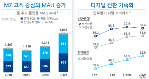 이날 노용훈 최고재무관리자(CFO)는 "적극적으로 디지털 트렌스포메이션(DT)를 실행한 결과 비대면 금융이 확대된 상황 속, 다양한 연령대를 아우르는 고객을 중심으로 기반을 확대해 나갈 수 있었다"며 "지난 9월 선포한 신한금융의 '더쉽고 편안한 새로운 금융'에 걸맞게 은행 및 카드 플랫폼에서 687만명이 순증했다"고 말했다.