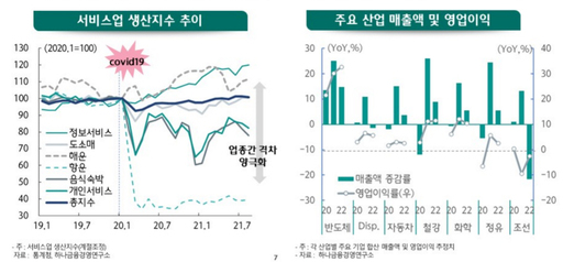 부분별로 보면 IT산업군의 경우 반도체는 경기가 둔화될 수 있지만, 파운드리가 시장을 견인하며 10%대의 성장세와 높은 수익성을 유지할 수 있다고 예상했다. 다만 디스플레 이는 LCD가격이 하락하고 코로나 특수가 소멸해 생산 및 수출액이 모두 감소해 부진할 수 있다는 전망이다.