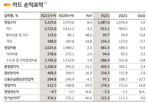 하나카드의 3분기 누적순익은 전년 동기 대비 73.9% 늘어난 1990억원으로 집계됐다. 전반적인 카드이용 증가에 따라 수수료이익은 6122억원을 기록했다. 이밖에도 디지털 프로세스 전환에 따른 비대면 소비 활성화 및 기업카드 영업 확대 등이 실적을 견인했다.
