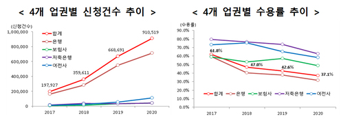 다만 이를 수용한 건수는 같은 기간 12만건에서 34만건으로 2.8배 증가에 불과했다. 비대면 서비스로 신청할 경우 증빙서류 미비 등으로 금리인하 요건을 갖추지 못한 경우가 많아서다.