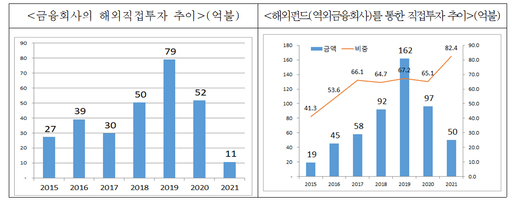 금융위에 따르면 국내 금융사의 해외진출이 활발해지면서 금융회사가 10% 이상의 지분을 취득하는 해외 직접투자가 증가하고 있다. 올해 금융사가 해외펀드에 직접투자한 금액은 50억달러로 비중은 82.4%에 달한다.