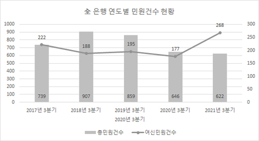 앞서 은행권 민원건수는 지난 2019년 파생결합펀드(DLF), 라임·옵티머스 등 사모사태로 정점을 찍다 지난해 하반기부터 감소해왔다. 지난해 1분기 906건이던 민원건수는 2분기 851건, 3분기 646건, 4분기 572건까지 떨어졌다. 올해 상반기까지 500건대를 유지하다 3분기부터 600건대로 올랐다는 설명이다.