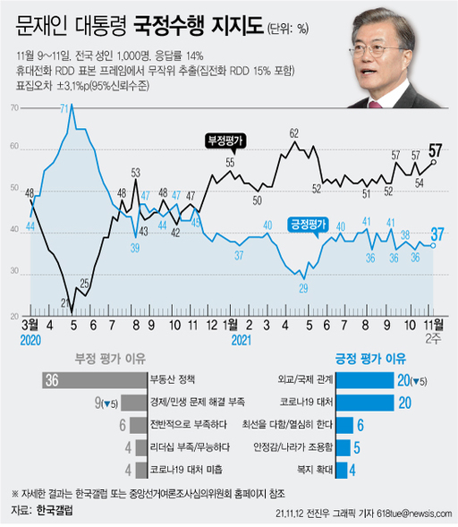 하지만 문 대통령의 노력에도 국정수행 지지율은 내렸다. 여론조사 업체 한국갤럽이 지난 9∼11일 전국 만 18세 이상 1000명에게 실시한 뒤 12일 공개한 문 대통령 직무 수행 긍정 평가(오차범위는 95% 신뢰수준에 ±3.1%포인트. 자세한 내용은 중앙선거여론조사심의위원회 홈페이지 참조)는 37%였다. 부정 평가는 지난주보다 1%포인트 오른 57%였다.