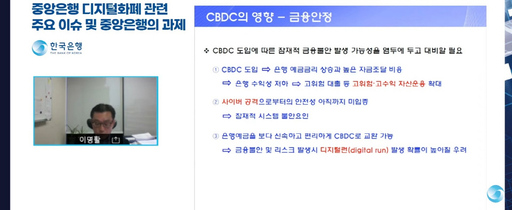 한편 이날 이명활 금융연구원 선임연구위원은 'CBDC 이해 및 영향'이라는 주제로 발표하면서 "한국은행이 CBDC 도입할 경우 중앙은행은 비은행 민간 경제주체를 대상으로 국공채를 매입하고 화폐를 발행할 수 있는 새로운 방안이 마련될 수 있다"고 말했다. 단 이 경우 CBDC가 은행예금을 대체해 은행의 자금중개 및 통화창출 기능은 약화될 수 있다.