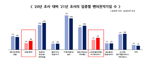 이런 가운데 코로나19를 기회로 성장한 의료·제약 관련 기업 10곳, 소프트웨어(SW) 개발·IT 기반 서비스 기업 8곳이 지난해 새롭게 1000억원 벤처기업에 이름을 올렸다.