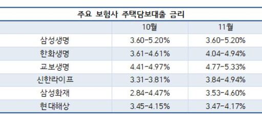 특히 주요 보험사의 주담대 금리는 지난 10월 연 2.84∼5.20%로 운영됐다. 한 달 만에 최저금리는 0.63%포인트(p), 최고금리는 0.13%p 오른 것이다.