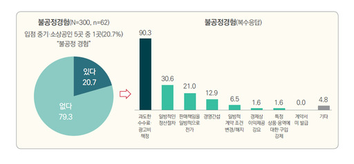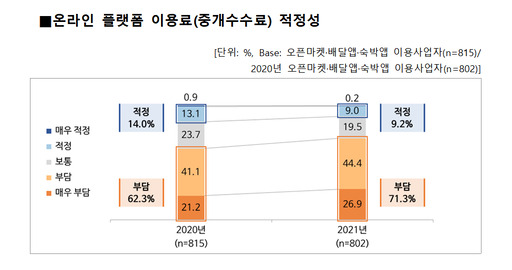 하지만 71.3%는 수수료가 '부담된다'고 밝혔다. 지난해 같은 조사에 비해 9%포인트(p) 늘었다. 또 절반이 넘는 53.4%가 '부당행위를 경험했다'고 답했다. 절반 이상은 '광고비 및 판매수수료'에 대한 부당행위를 꼽았다.