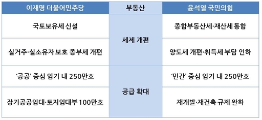 이재명 민주당·윤석열 국민의힘 후보가 발표한 부동산 정책 공약 핵심 키워드는 ▲세제 개편 ▲공급 확대로 요약할 수 있다. 문재인 정부가 추진한 부동산 세제 및 공급 정책에 대한 국민들의 불만을 반영한 것으로 풀이되는 대목이다.