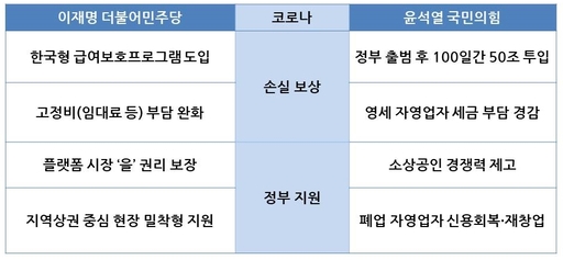 이에 이재명·윤석열 후보는 소상공인·자영업자 중심으로 코로나 팬데믹 위기 극복 차원의 정부 지원 방침이 담긴 공약을 제시했다. 다만 지원 기준에 있어 이 후보는 '보편', 윤 후보의 경우 '선별'을 지향한다. 이는 민주당과 국민의힘이 지향하는 정책 방향과 맞닿아 있다.
