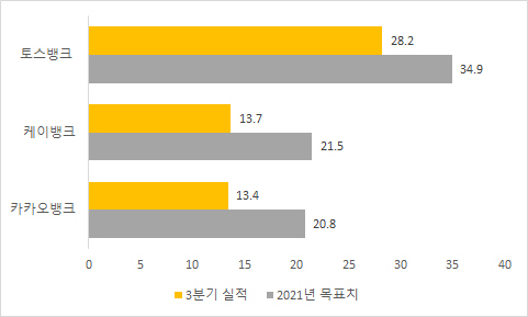 29일 은행권에 따르면 인터넷은행의 3분기말 기준 중금리 대출 비중은 케이뱅크 13.7%, 카카오뱅크 13.4%, 토스뱅크 28.2%다.