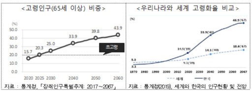통계청에 따르면 오는 2025년에는 고령인구가 20%를 초과해 초고령사회에 진입할 것으로 관측된다. 지난 2018년 기준 우리나라 65세 인구 기대여명도 남성 18.7세, 여성 22.8세로 OECD 평균을 초과했다.