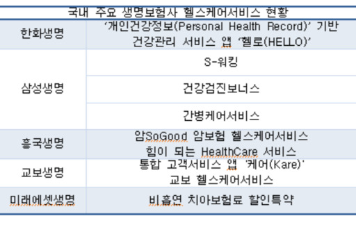 그 밖에도 국내 주요 생보사는 ▲건강관리서비스 및 콘텐츠 지원 ▲실제나이가 아닌 건강나이를 산출해 보험료 할인 ▲활동목표치 달성에 따른 리워드 지급 등 다양한 헬스케어서비스 지원을 이어오고 있는 모습이다.