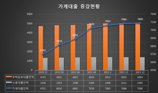 4일 금융권에 따르면 KB국민·신한·하나·우리·NH농협 등 5대 시중은행의 지난해 말 가계대출 잔액은 709조529억원으로 집계됐다. 전년 말(670조1539억원)과 비교하면 5.80%(38조8990억원) 늘었다. 금융당국이 지난해 제시한 증가율 목표치인 6%까지 차오른 셈이다.