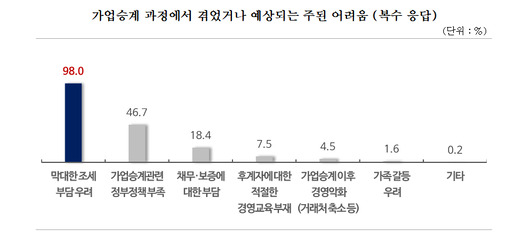 그럼에도불구하고 설문에 참여한 98%의 기업이 가업승계 과정에서 가장 큰 어려움(복수응답)으로 '막대한 조세 부담'을 꼽았다. 그 다음은 '가업승계관련 정부정책 부족'(46.7%), '채무·보증에 대한 부담'(18.4%) 등의 순이었다.