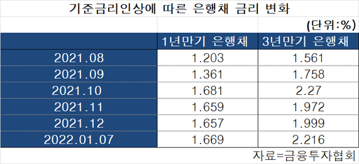 금융투자협회에 따르면 1년만기 은행채 금리는 지난해 8월 금리인상을 한 뒤 꾸준히 금리가 오르고 있다. 지난해 9월 신용등급 AAA 1년만기 은행채 금리는 1.361%로 전월 대비 0.158%p 상승했고, 10월에는 0.681%로 전월 대비 0.32%p 올랐다.