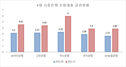 9일 은행연합회에 따르면 KB국민·신한·하나·우리·NH농협 등 5대 시중은행의 지난해 12월 신용대출금리는 평균 연 5.0%로 집계됐다. 하나은행이 연 6.0%로 가장 높았고, KB국민은행과 신한은행이 각각 4.61%, 4.45%로 뒤를 이었다. 지난해 6월 이들 은행의 신용대출 금리가 평균 연 3.0%였던 것과 비교하면 큰 폭으로 오른 셈이다.