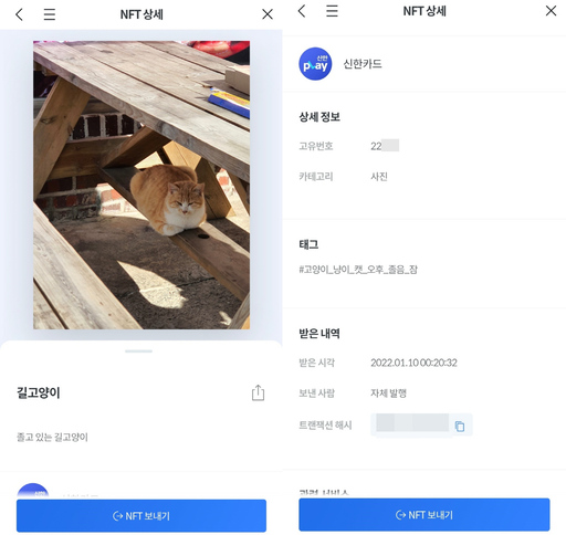 고객은 자신이 소장한 물건이나 간직하고 싶은 순간을 NFT로 등록하고, 신한플레이 앱을 통해 등록한 NFT를 조회할 수 있다. 다만 마이 NFT 서비스를 통해선 NFT의 생성과 조회만 가능하다. 거래 및 유통 기능은 불가하다. 신한카드는 관련 시장이 성숙해짐에 따라 NFT 관련 서비스를 고도화할 방침이다.