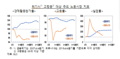 고령층의 노동시장참가율도 과거 글로벌 금융위기(2008~2010년) 시 상승 흐름과는 달리 하락하는 양상을 기록했다. 고령층의 노동시장 복귀가 더딘 것은 건강상의 이유 등으로 자발적으로 퇴직한 고령층이 크게 늘어난 데 주로 기인했다는 분석도 나온다.