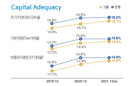 그룹의 BIS자기자본비율은 16.1%, 보통주자본비율은 13%이다. 이태경 CFO는 "자산성장으로 인한 위험가중자산이 증가했지만, 견조하게 순이익을 창출하면서 높은 수준의 자본적정성을 유지했다"고 말했다.