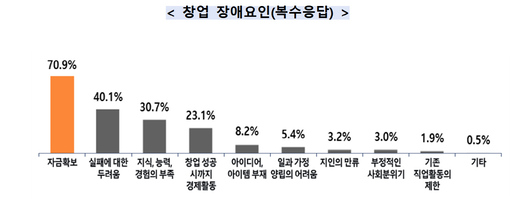 이런 가운데 창업 준비단계에서 창업기업들이 꼽은 주요 장애요인(복수응답)은 '자금확보'가 70.9%로 가장 높았다. 다음으로는 '실패에 대한 두려움' 40.1%, '창업 지식·능력·경험 부족' 30.7%, '생계유지' 23.1% 순이었다.