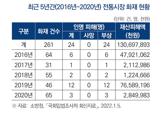 2016~2020년, 전통시장 화재만 261건…피해액 1307억