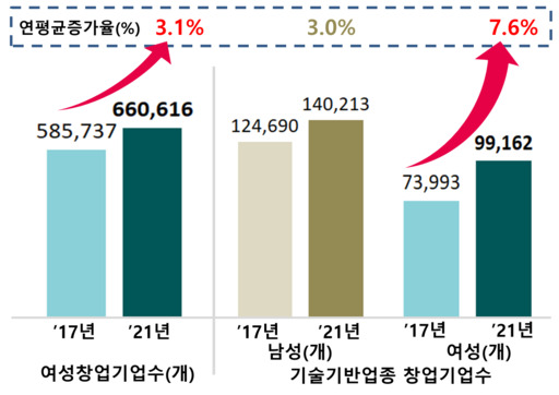 2017년 대비 2021년 현재 기술기반업종 창업의 경우 여성기업은 7만3993개에서 9만9162개로 7.6% 늘었다. 반면 같은 5년간 남성기업은 12만4690개에서 14만213개로 갯수는 많았지만 증가율은 3%로 여성기업 창업의 절반에도 미치지 못했다.