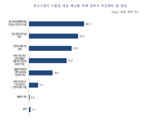 이외에 '긴급경영안정자금 지원'(41.2%), '안정적 외환시장 관리'(35.8%), '피해기업 대상 은행 대출금 상환기간 연장 등 유동성 지원'(31.6%) 등이 필요한 것으로 파악됐다.