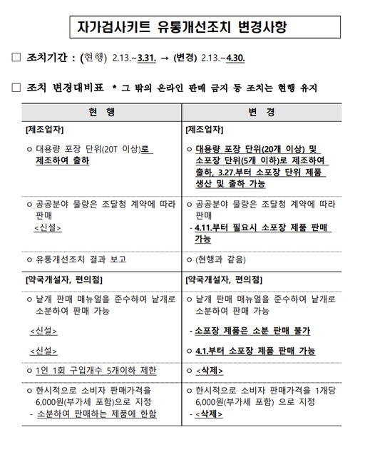 식약처도 기존 유통개선조치를 이번에 일부 완화하면서 "자가검사키트 유통·공급이 안정화되고 있어 일부 제한을 해제해 자가검사키트 구매 편의성을 높이기 위해 (완화 조치를)마련했다"고 전했다.