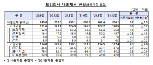 6일 금융감독원에 따르면 지난 12월 말 기준 보험회사 대출채권 잔액은 266조1000억원으로 전분기 말 대비 3조7000억원 증가했다.
