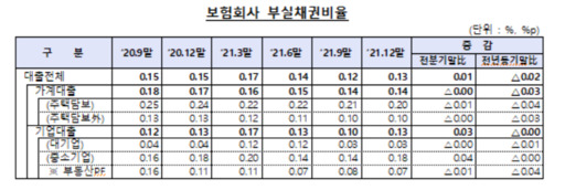 보험회사 부실채권비율은 0.13%로 전분기 말 대비 0.01%포인트 상승했다.