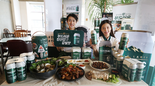 오비맥주 한맥이 25일 서울 마포구 한 카페에서 홈플러스와 함께 하는 '한식엔 한맥' 프로모션을 알리고 있다.