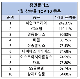 상승률 TOP 2종목은 '하인크코리아(242.37%)'와 'KG스틸(119.11%)'