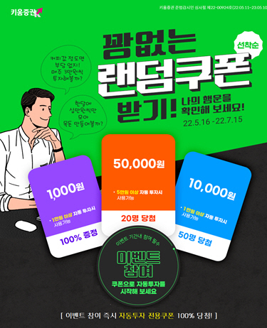 키움증권은 '꽝 없는 랜덤쿠폰 받기! 펀드 자동 투자 쿠폰 지급' 이벤트를5월16일부터 7월15일까지 진행한다고 18일 밝혔다.