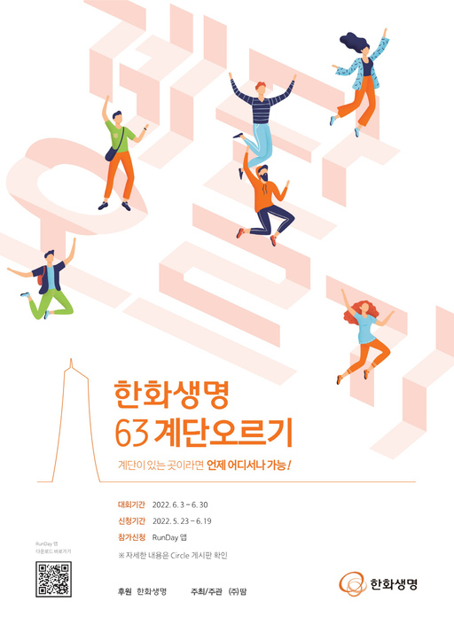 한화생명은 오는 6월 3일부터 30일까지 한 달간 '제18회 한화생명 63 계단오르기' 행사를 개최한다고 24일 밝혔다. 한화생명 63 계단오르기는 63빌딩 높이인 249m에 오르는 이색 마라톤 행사로, 올해는 '런 데이(Run Day)' 애플리케이션을 통해 비대면으로 개최한다.