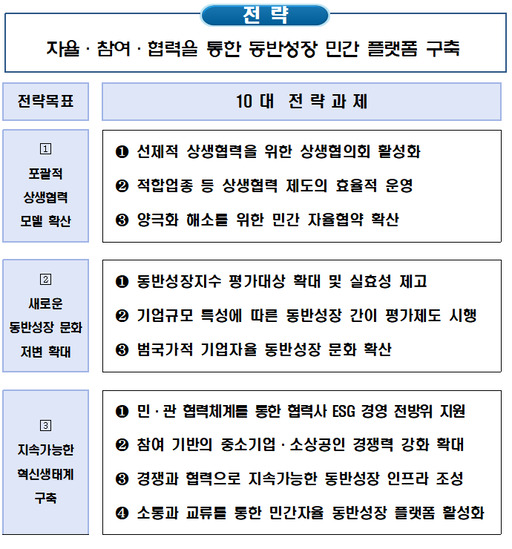 ▲포괄적 상생협력 모델 확산 ▲새로운 동반성장 문화 저변 확대 ▲지속가능한 혁신생태계 구축이 '3대 전략목표'다.