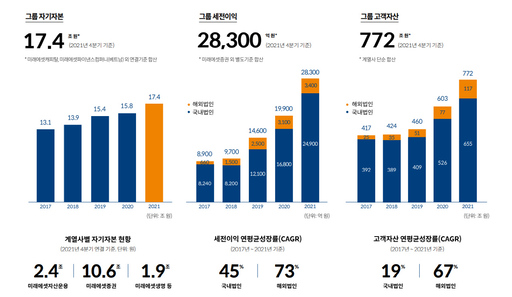 미래에셋의 자기자본은 지난해 말 기준 17조4000억원에 달한다. 세전이익은 2조8300억원으로 연평균성장률(CAGR)이 국내 법인은 45%, 해외 법인은 73%에 달한다. 특히 계열사별 자기자본 현황으로는 미래에셋증권 10조6000억원, 미래에셋자산운용 2조4000억원, 미래에셋생명 1조9000억원이다. 미래에셋증권은 국내 증권업계 최초로 자기자본 10조원을 넘기며, 대형 투자은행(IB)으로 자리매김했다. '한국판 골드만삭스'의 꿈에 성큼 다가선 것이다.