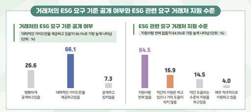 조사에 따르면 거래처의 ESG 경영 요구기준에 대해서 '대략적인 가이드만을 제공하고 있다'는 응답이 전체에 66.1%에 달했다. '명확하게 공개하고 있다'는 경우는 26.6%에 그쳤다.