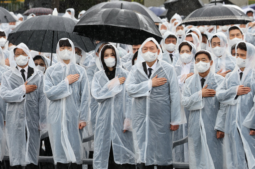 한편 윤 대통령은 추념사에서 "이제 후손들에게 더욱 자유롭고 평화로운 대한민국을 가꾸고 물려줄 사명이 우리에게 있다. 자유와 민주주의, 인권의 가치를 추구하는 위대한 대한민국은 조국을 위해 헌신한 이들의 희생을 가치 있게 만들 것"이라며 "영웅들의 용기를 국가의 이름으로 영원히 기억하겠다"는 메시지도 전했다.