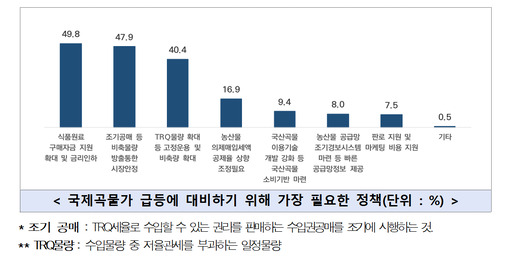 국제 곡물가 급등에 대응하기 위해 가장 필요한 정부 정책(복수응답)으로는 전체의 49.8%가 '식품원료구매자금 지원확대'를 꼽았다. 이어 ▲조기공매 등 비축물량 방출을 통한 시장안정(47.9%) ▲TRQ물량 확대 등 고정운용 및 비축량 확대(40.4%) ▲농산물 의제매입세액 공제율 상향조정 필요(16.9%) 순으로 많았다.