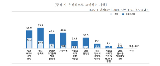 이런 가운데 청년들이 구직시 우선적으로 고려하는 사항으로는 1순위가 '일과 여가의 균형 보장'(33.2%)이었다. 이외에 '임금만족도'(22.2%), '건강한 조직문화·사내 분위기'(15%)가 그 뒤를 따랐다.