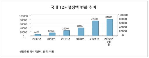디폴트옵션 선택지는 ▲TDF ▲장기 가치상승 추구펀드 ▲머니마켓펀드(MMF) ▲인프라 펀드 ▲원리금보장 상품 등 다섯가지다. 이 중 TDF가 노후 자금 투자에 특화돼 있다는 점에서 디폴트옵션의 핵심으로 자리 잡을 것이란 평가다.