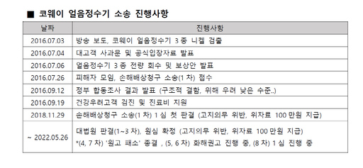 문제가 불거지자 해당 얼음정수기 모델을 이용한 A씨 등은 코웨이에 대해 각각 300만원의 손해를 배상하라며 소송을 청구했다.